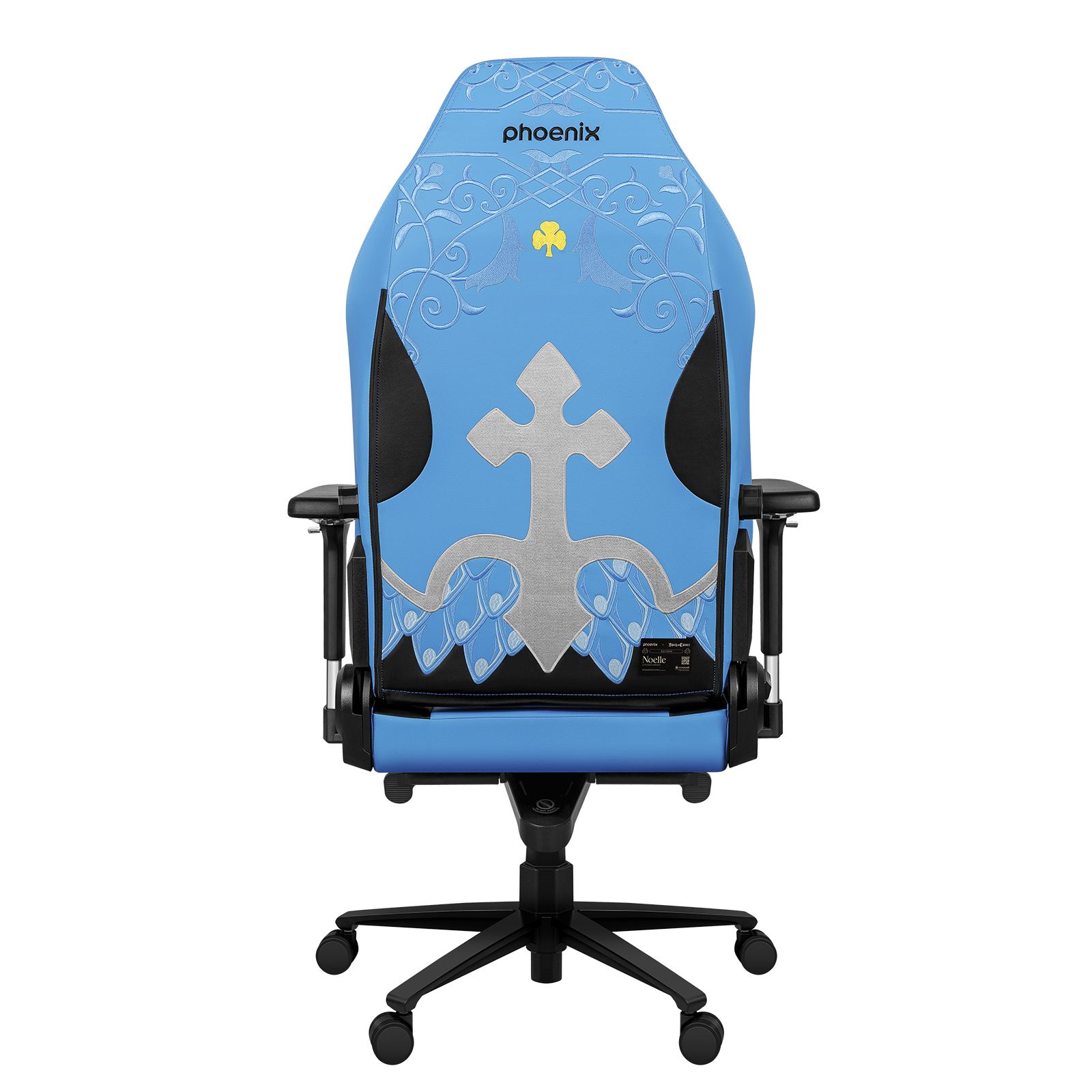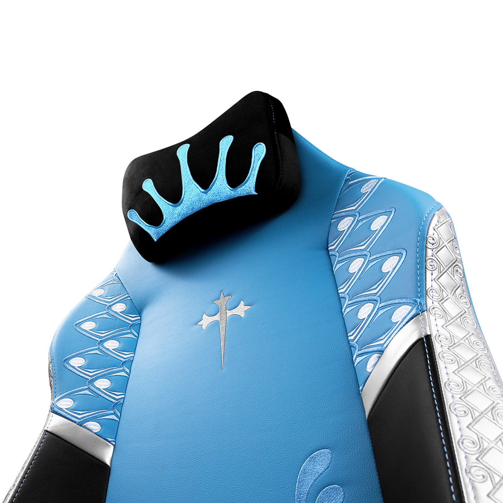 Desde el primer vistazo, la silla irradia majestuosidad. El frontal se viste con un azul intenso adornado con patrones plateados que evocan las olas y corrientes marinas de su magia, mientras un bordado brillante en el reposacabezas se eleva como una corona, símbolo de su linaje real y de la dignidad que porta en batalla. Cada costura, enmarcada con precisión artesanal, fluye como el agua misma, recordando tanto su gracia como su feroz determinación.