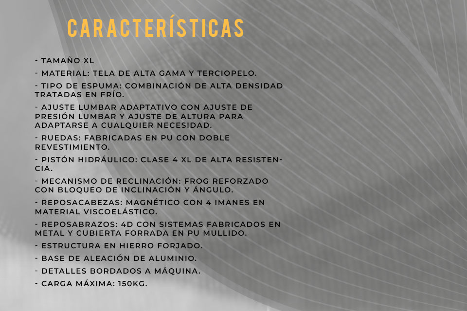 4D armrests made entirely of metal. Smooth and precise adjustment in every direction and a refined lever system with exquisite operation. Its cover is finished in PU for a stable and comfortable support.