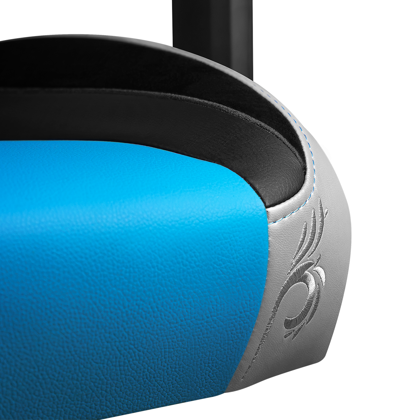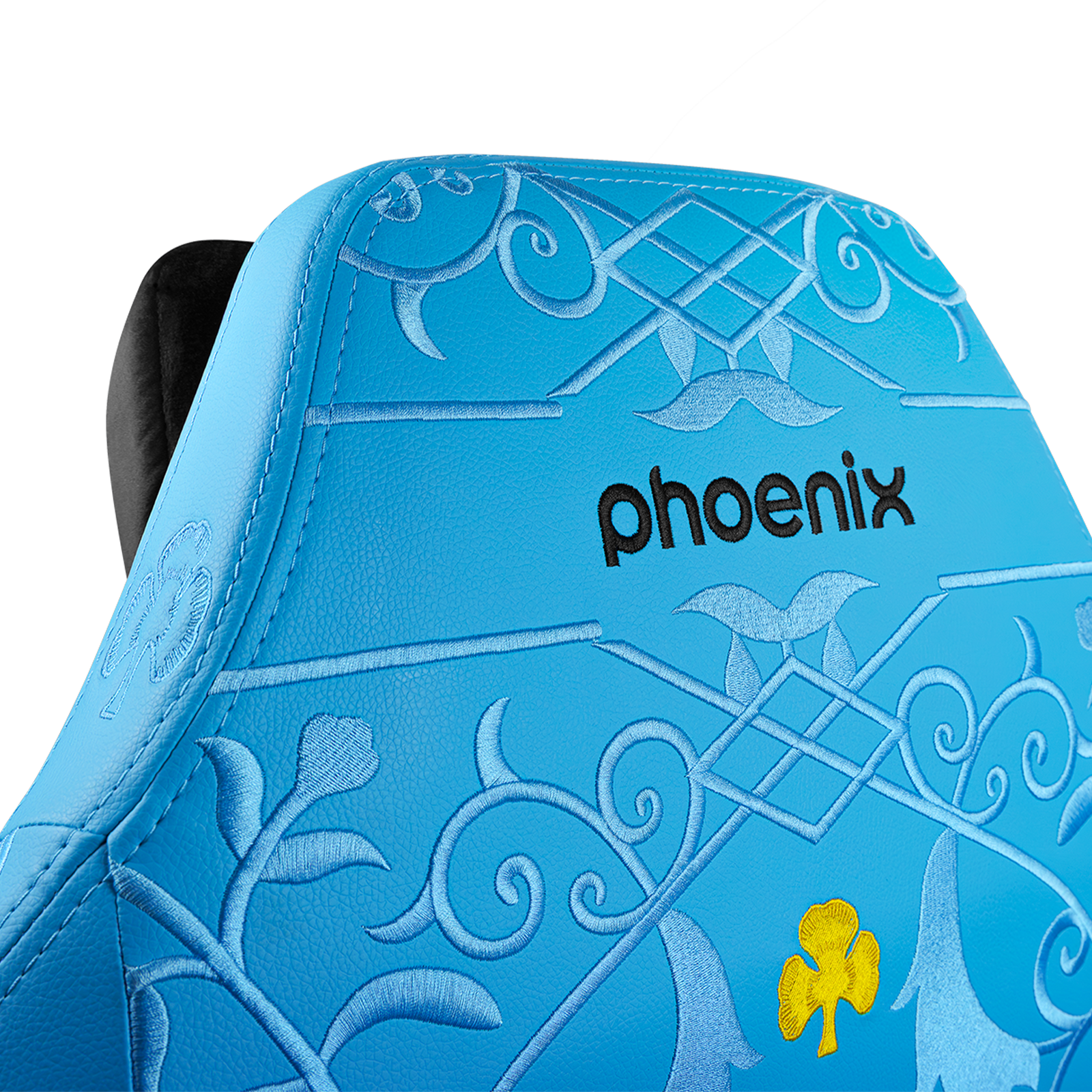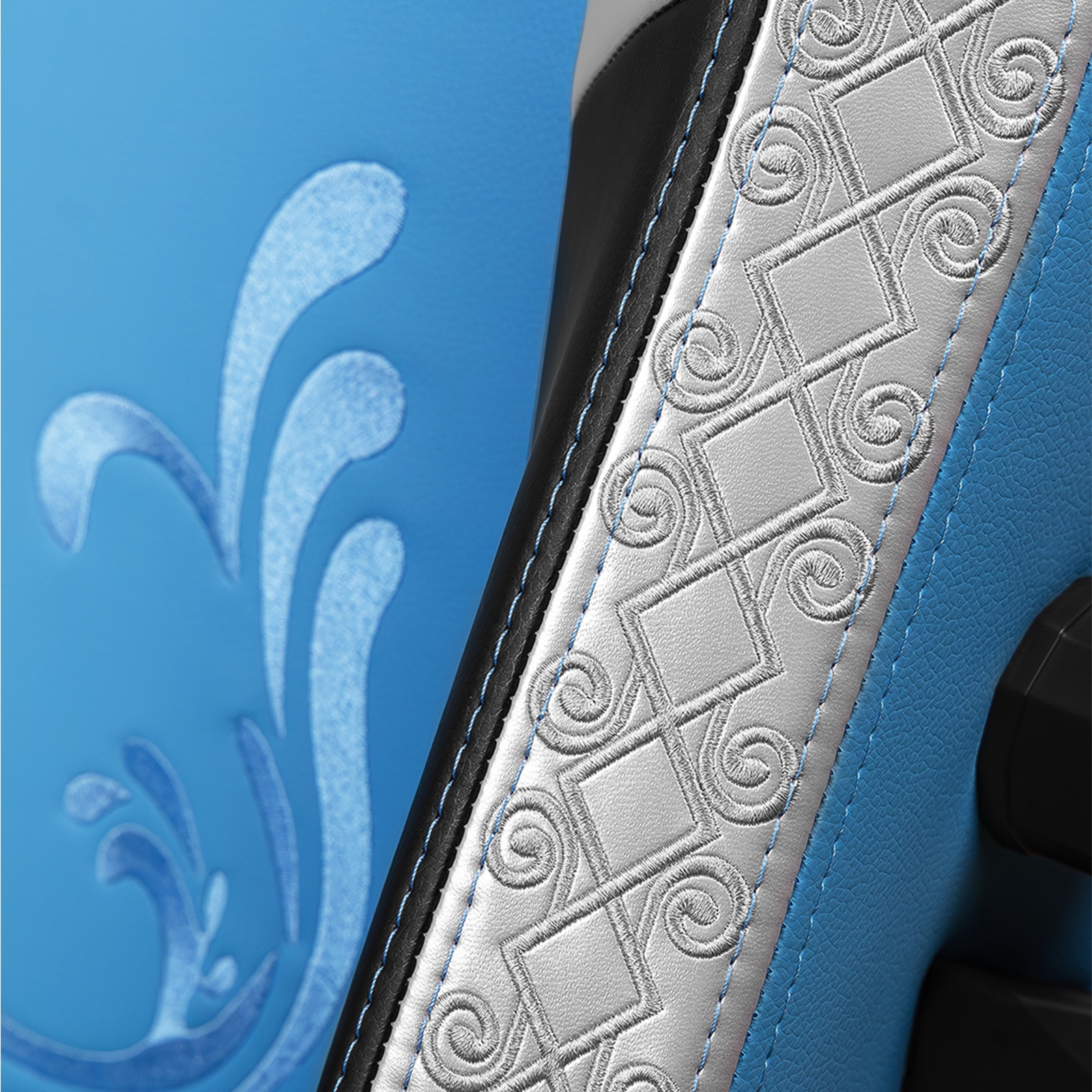 Desde el primer vistazo, la silla irradia majestuosidad. El frontal se viste con un azul intenso adornado con patrones plateados que evocan las olas y corrientes marinas de su magia, mientras un bordado brillante en el reposacabezas se eleva como una corona, símbolo de su linaje real y de la dignidad que porta en batalla. Cada costura, enmarcada con precisión artesanal, fluye como el agua misma, recordando tanto su gracia como su feroz determinación.