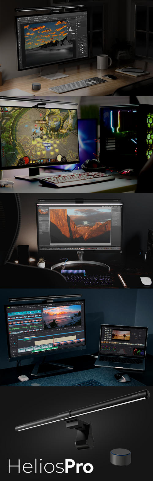 Si eres de los que usan 2 monitores para la edición de vídeo, programación, diseño, retoque, o inversiones, esta función de HeliosPro permitirá proteger tu vista a la vez que ilumina tu espacio de trabajo creando un espacio cómodo y confortable. HeliosPro es tu accesorio de iluminación imprescindible para el día a día.