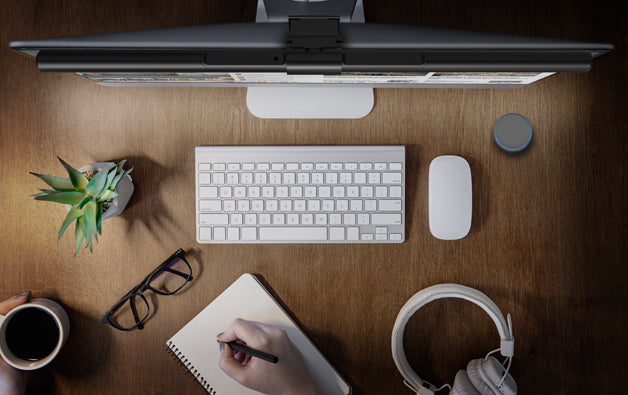 Pero no sólo ilumina tu monitor, sino que también ilumina un área de tu escritorio para que puedas trabajar cómodamente. HeliosPro no es sólo una lámpara para tu monitor, sino que también funciona como una lámpara de escritorio; y lo que es mejor: sin ocupar espacio en tu mesa.
