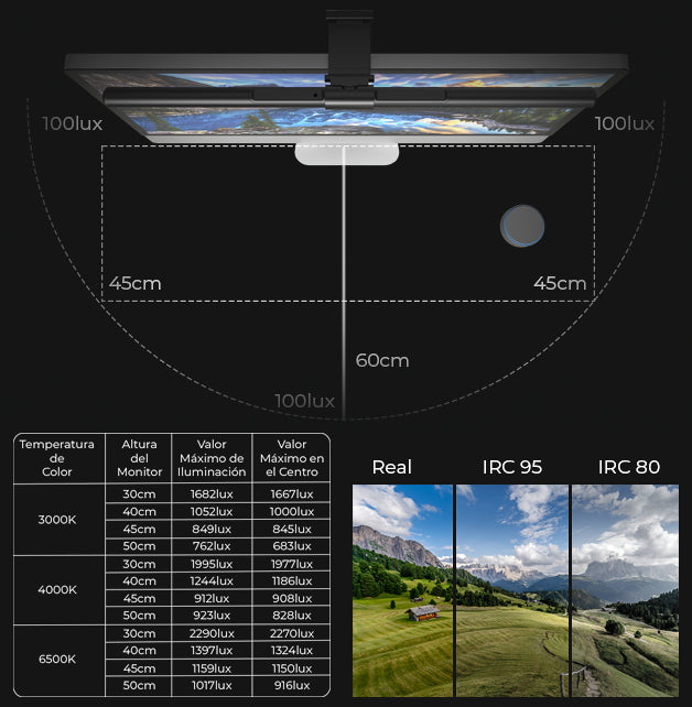 El área de iluminación de HeliosPro sobre tu mesa dependerá de la altura de tu monitor, la temperatura de color y la intensidad de luz. Así pues podrás ajustar los parámetros en función de tus necesidades.