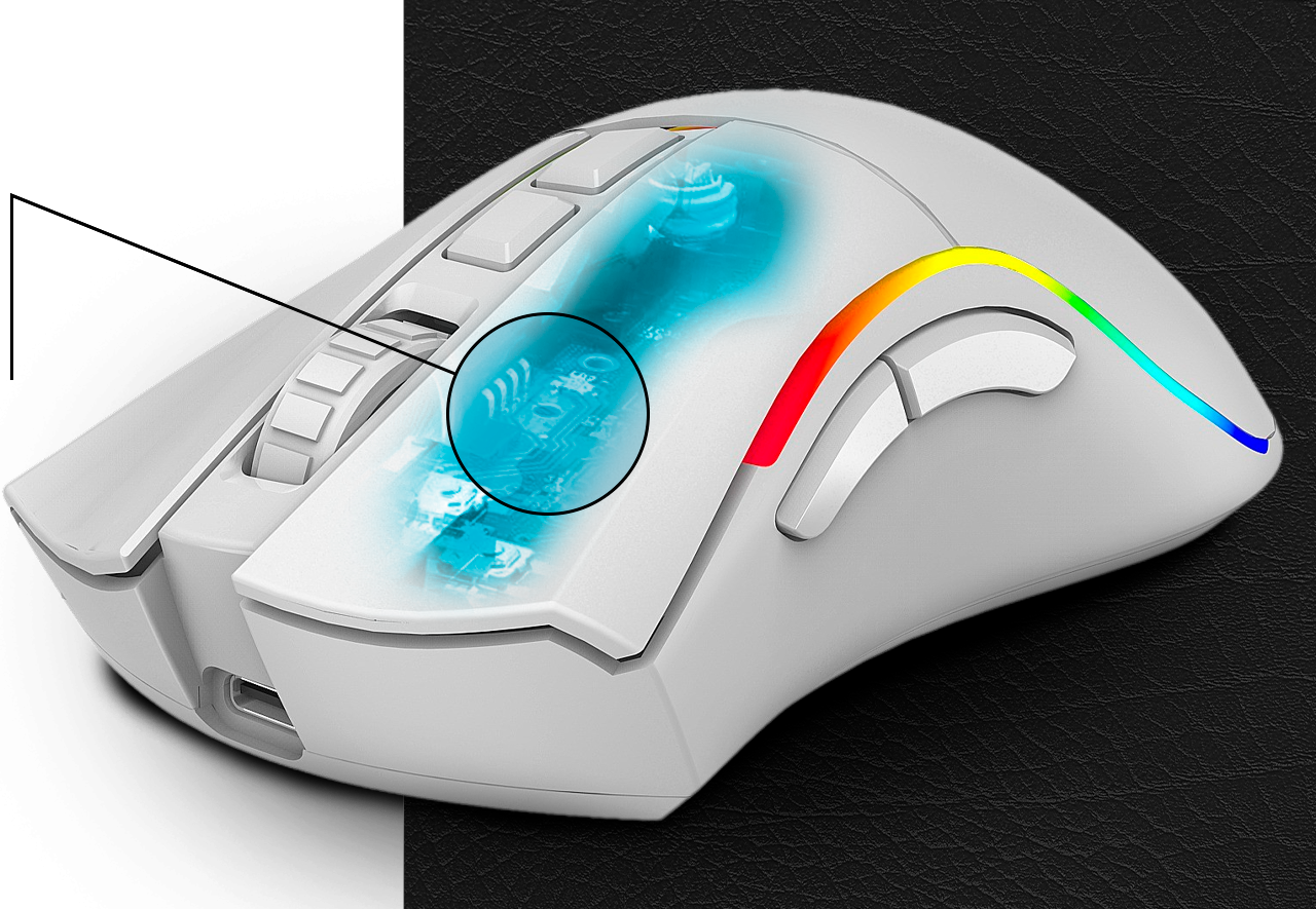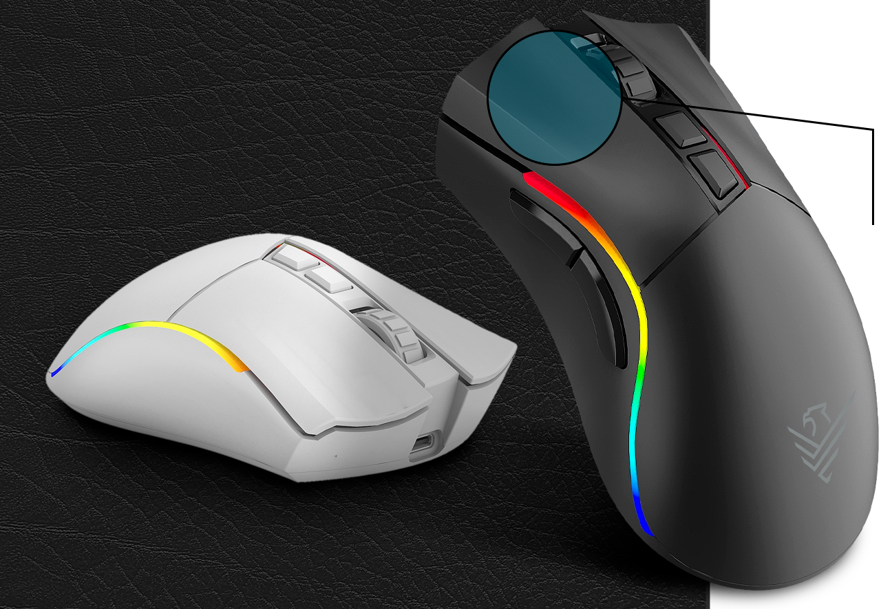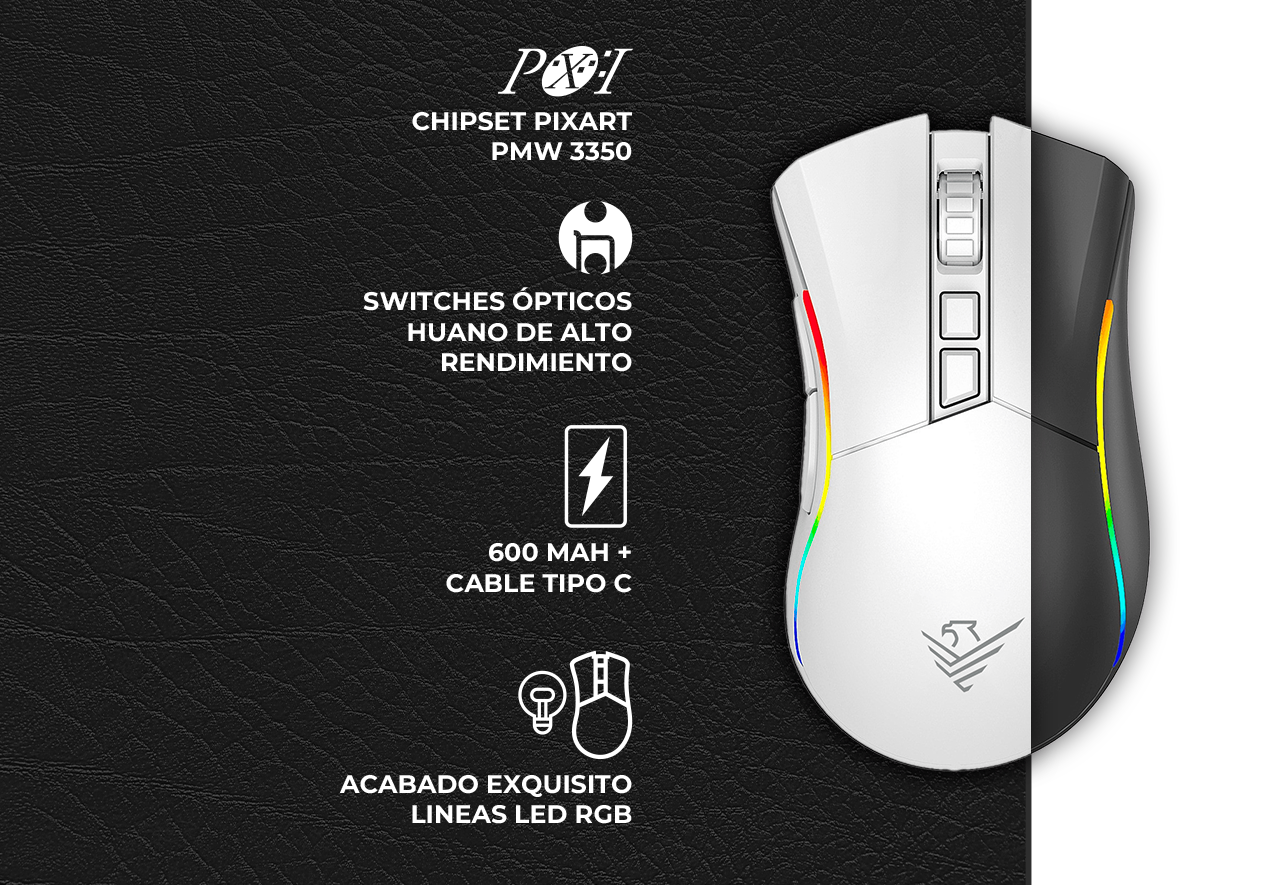 Su corazón está impulsado por el sensor óptico Pixart PMW3335, uno de los más precisos del mercado, capaz de alcanzar hasta 19.000 DPI, 400 IPS de velocidad de seguimiento y aceleración de 50G. Esta combinación garantiza movimientos suaves, control absoluto y tiempos de respuesta ultrarrápidos, ideales para eSports y juegos de alta exigencia.