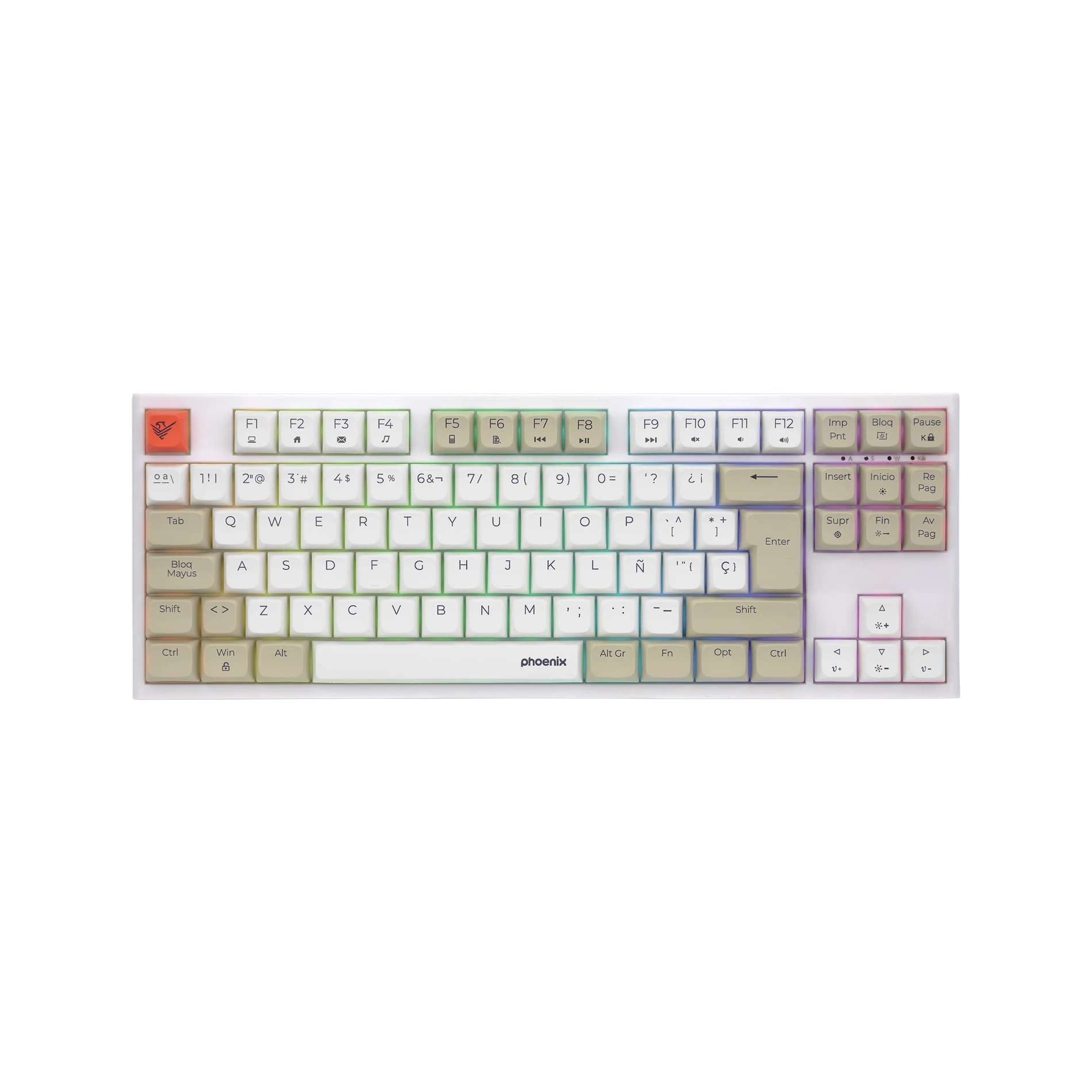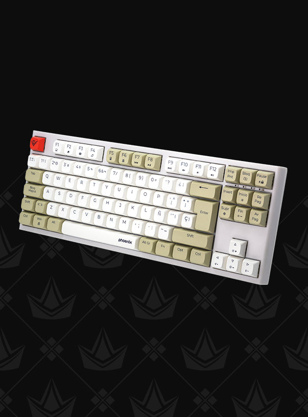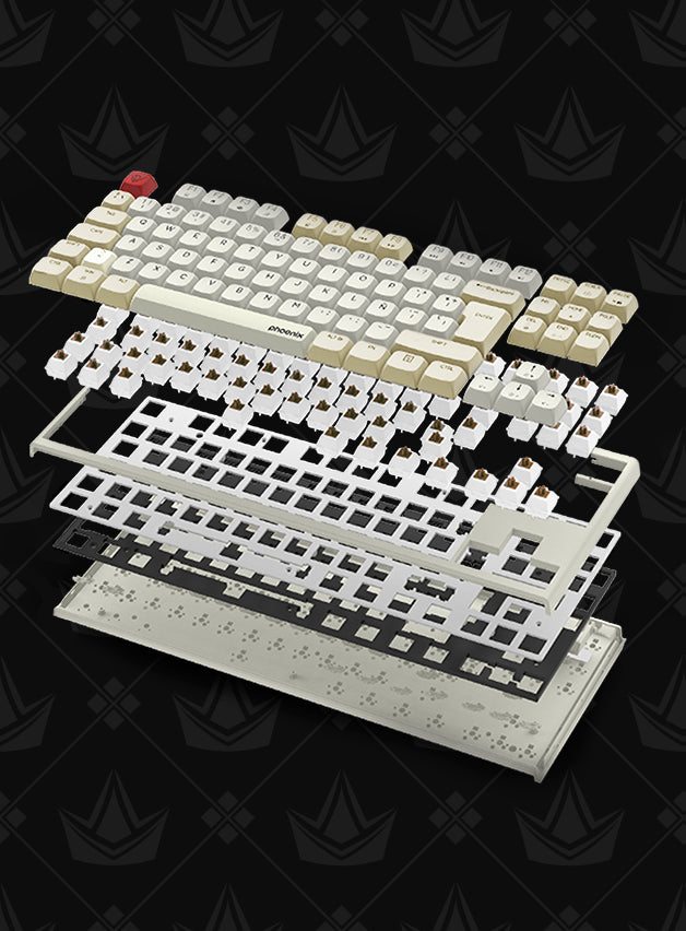 Phoenix Royal ha sido fabricado en un formato TKL (Tenkeyless), lo que significa que cuenta con un diseño compacto sin el teclado numérico, lo que lo hace más cómodo y fácil de transportar. Su estructura multicapa está diseñada con espuma EVA para reducir la sonoridad y minimizar el ruido de las teclas al escribir o jugar. Además, cuenta con una placa de estructura interna metálica, lo que garantiza una mayor durabilidad y estabilidad durante largas sesiones de juego.